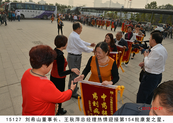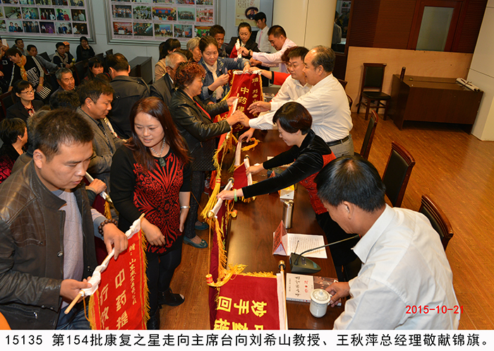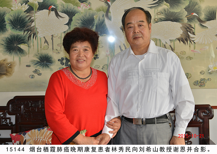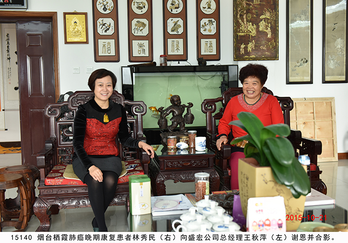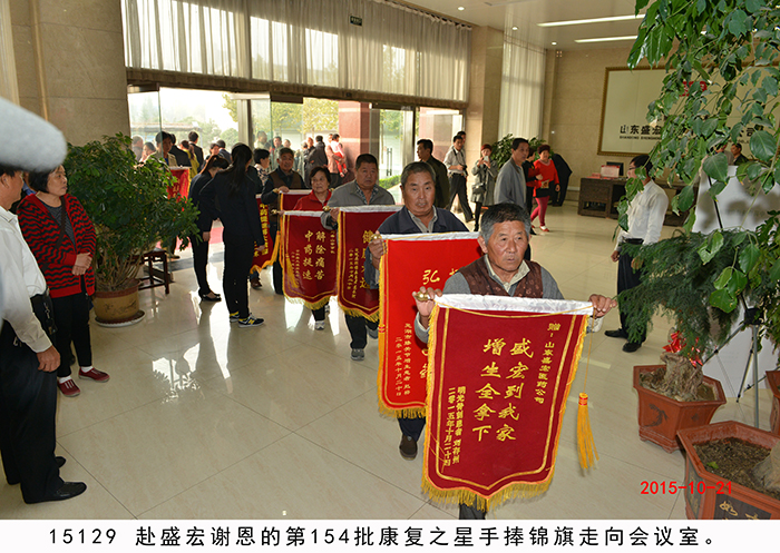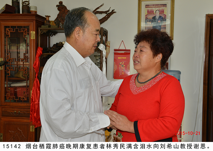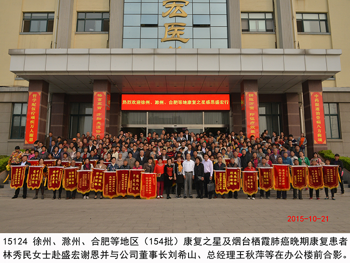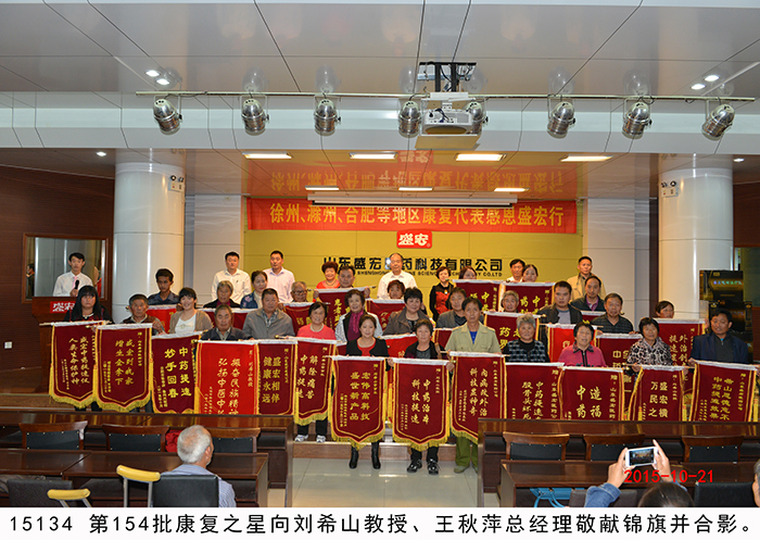 2015年10月21日 ,安徽、江蘇、山東等三省數地市的康復患者300多人赴山東盛宏醫藥科技有限公司謝恩,這是第154批赴盛宏的謝恩者,謝恩人數達到了近六萬人。盛宏公司董事長劉希山、總經理王秋萍親自迎接,場面感人。無數患者用鮮紅的錦旗和樸實的話語表達感激之情。 其中,一位年過花甲、氣色 紅潤的 女士一人提了六箱蘋果來感謝 劉希山 教授。誰也想不到,她曾經是一位極度虛弱、頭發脫落、不能站立的肺癌晚期患者,醫生說她還能活一星期左右…… 一箱蘋果、一封信,感動“哲人奇人”大愛心 她叫林秀民,煙臺棲霞人,因患肺癌在醫院治療花了100萬,等來的卻是“你的生命也就是一個星期左右,最多不會超過三個月”的醫生判決。她心灰意冷,知道自己的生命走到了盡頭。 2013 年12月5日 ,她給心中尊敬的中藥提速專利發明人、莫言題贊為“哲人奇人”的 劉希山 教授寄去了一箱煙臺蘋果,并附了一封道別信:“俺叫林秀民,是煙臺市棲霞縣桃村鎮上的一名普 通 女士……又有兩年多沒有見到您了,我去年查出肺癌,精神很不好,特想您,只有給您郵幾個蘋果來解除我的想念之苦……再見了董事長,希望您好好保重身體,祝您萬壽無疆!”