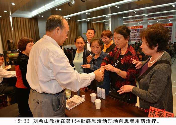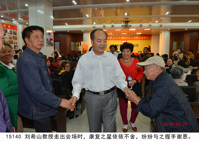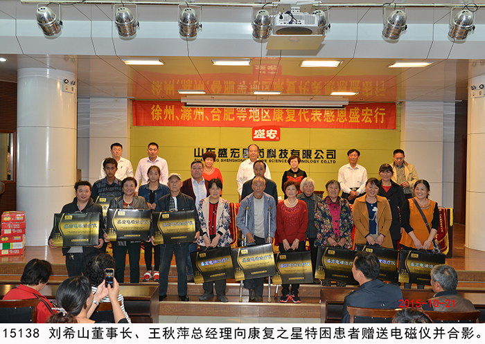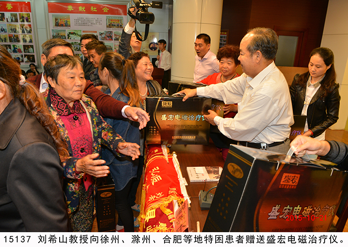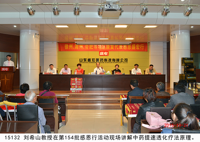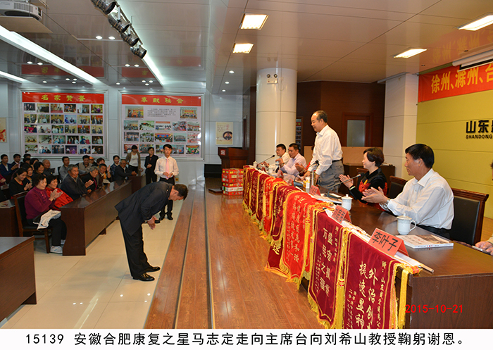 跪地謝恩,全場落淚 兩年之后的2015年10月, 林秀民 女士體重由不到120斤增加至160多斤,身體復元,生活完全能夠自理。 10 月18日 ,劉希山董事長收到一條短信:“您好劉哥哥,我是桃村的林秀民,我想帶著棲霞蘋果去看您,什么時間去好呢?”劉希山董事長當即回復:“你好了我很高興,你21號上午9點到最好,歡迎你!” 10 月21日 早上8:20,林秀民提前來到了盛宏公司,她精神矍鑠,氣色紅潤,聲音洪亮,一點不像一個得過癌癥的人。見到劉希山董事長,林秀民緊緊握住他的手,感恩的淚水再也止不住了……林秀民面對安徽、江蘇、山東等地的300多名病友講述了康復經過,動情之處淚水隨著流下,并當場向劉希山教授跪地謝恩。醫患情深、愛心交融的場景感動了全場落淚。 林秀民 女士現場清唱了《大海航行靠舵手》,徐州 潘劍 先生于謝恩獻錦旗之后演唱了《毛主席的光輝》,他們同樣用發自肺腑的感恩之心,唱出了全體頑疾康復患者把 劉希山 教授當做醫學界偉人的心聲。 五大療法,癌癥卻步;愛心交融,感天動地 劉希山 教授應邀為三省客人作健康報告,揭示出盛宏中藥提速用于腫瘤治療效果奇特的秘密:“我在研究美國專家關于腫瘤的科研成果時,發現40℃以上高溫對腫瘤有明顯抑制作用,為此我繼續展開研究,并總結出五大療法:一是40-45℃的熱療;二是電螺旋磁療;三是遠紅外治療;四是高強度透化療法;五是中藥提速透皮技術。” 劉 教授的“五大療法”,十八年來為無數患者延長延續了生命。 劉 教授最后總結:“林秀民的康復證明:一個醫藥企業除了要有一個好產品,還要有醫者的愛心和患者的感恩心這兩種心的交融。心靈交融,感天動地。小小頑疾能不好嗎?” 全場報以經久不息的掌聲。