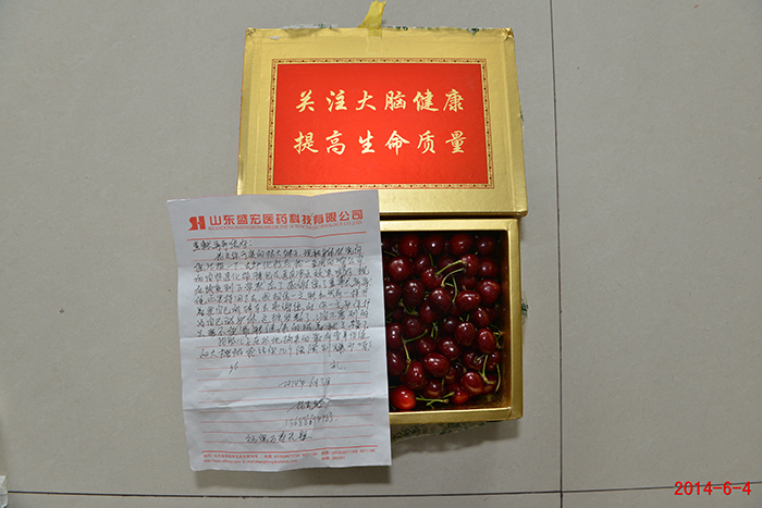此后,劉希山董事長不斷給予林秀民大愛關懷和治療上的科學指導。 劉 教授突破常規,讓她用三臺電磁治療儀同時治療,三臺儀器共六個電磁熱墊,用于背后三個、胸前三個,同時施治。這可是常人用量的3-6倍,從來沒有人敢這樣用過!卻讓本來就功效不凡的中藥提速透化療法發揮到了最佳狀態,林秀民咳出了一粒粒花生米大小的腫塊后,肺部舒暢了。治療方案獲得成功。 2014 年6月 4日,林秀民滿懷感恩之情,又為劉希山教授寄來了櫻桃和感謝信。