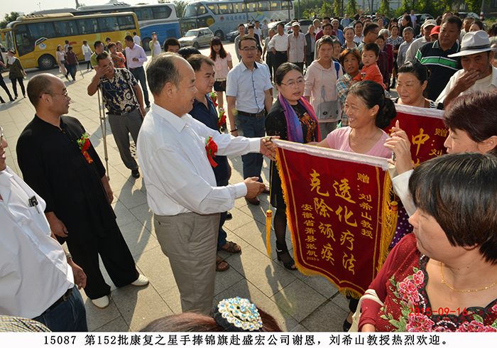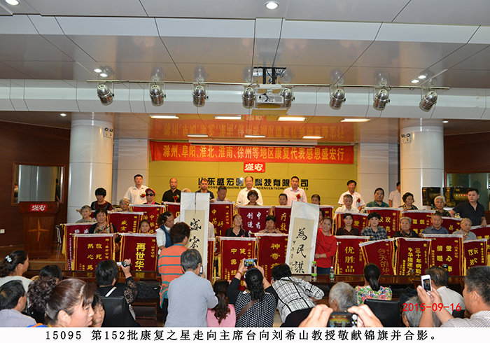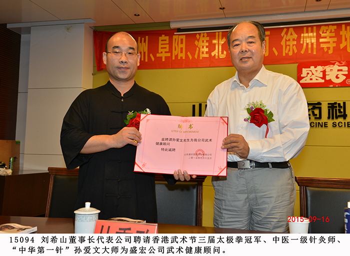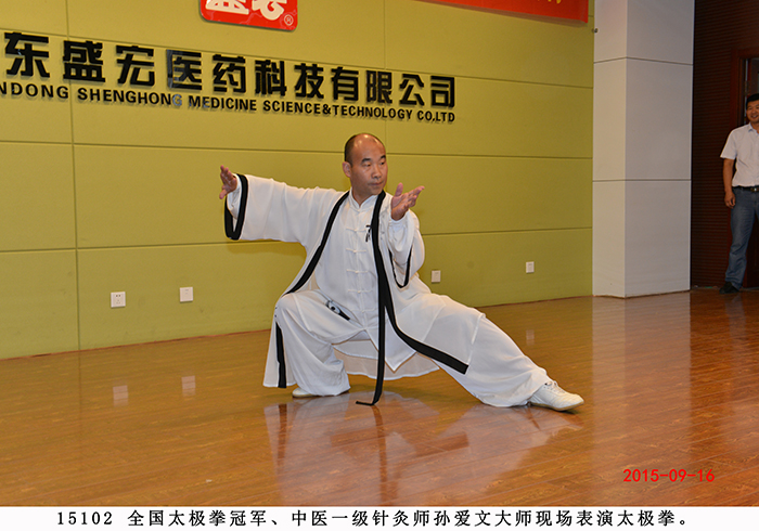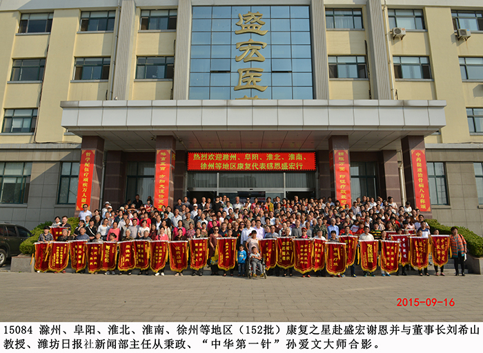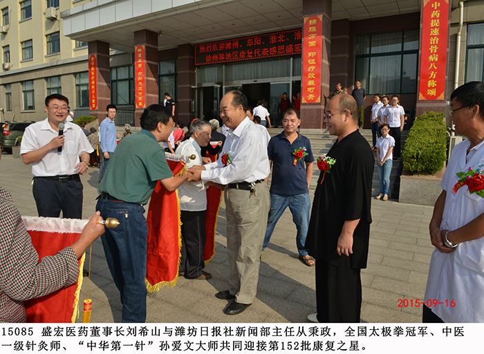 | 第152批康復患者赴盛宏謝恩——全國太極冠軍、針 灸大師孫愛文蒞臨現場并作精彩表演 2015 年9月16日 ,安徽滁州、阜陽、淮北、淮南及江蘇徐州、山東日照等地300多名股骨頭壞死、腰椎間盤突出、頸椎病、肝病、腎病、糖尿病等頑疾康復患者攜帶錦旗,不遠千里來到山東盛宏醫藥公司謝恩。中藥提速專利發明人、盛宏公司董事長劉希山教授,濰坊學院宣傳部部長徐樹芝先生,濰坊日報社新聞部主任從秉政先生,全國太極拳冠軍、香港武術節三屆太極拳冠軍、中醫一級針灸師、“中華第一針”孫愛文大師,共同接見了謝恩者。安徽中藥提速服務中心主任黃鳳偉代表患者致感謝詞。劉希山董事長應邀為客人作了精彩的健康報告,用通俗的語言揭開了中藥提速透化療法和中藥提速頭皮技術治療骨病頑疾的秘密;并以慈父般的愛心,現場向特困患者贈送了盛宏電磁治療儀。全場響起陣陣熱烈的掌聲。劉希山董事長代表公司聘請徐樹芝先生為盛宏“文化學術顧問”,聘請孫愛文大師為“武術健康顧問”。 孫愛文大師現場表演了中華國粹——陳式太極拳。只見他下盤沉穩如磐石,上身游動似蛟龍,掌發陰陽,腳踏虛實,本無極而生太極,由小我而動乾坤,招招形神兼備,忽而云中響驚雷,風吹楊柳折斷枝……陳氏太極的精髓神韻被孫大師發揮得淋漓盡致!真不愧德國、法國等十三國“武術教頭”、全國散打擂臺賽冠軍、全國太極拳冠軍、香港三屆太極拳冠軍之美譽。孫愛文大師的表演使感恩現場的氣氛達到了高潮,臺上臺下響起雷鳴般的掌聲。 據悉,赴盛宏謝恩的全國康復患者達到了27省、100多地市、152批,共計五萬多人次。