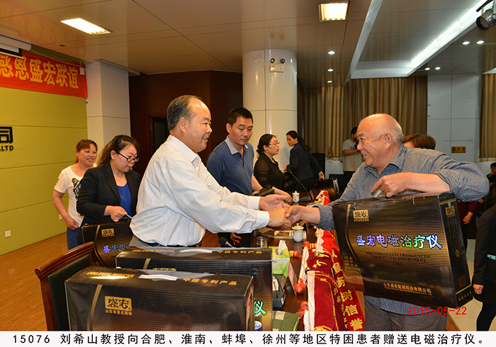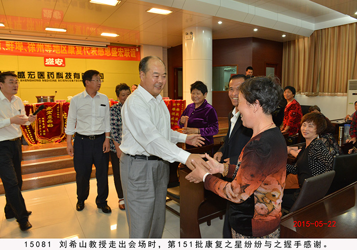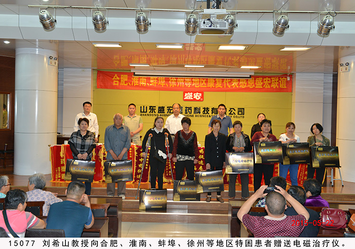 全國第151批腰椎間盤突出等頑疾患者赴盛宏謝恩 大愛無涯,醫患情深。 2015年 5月 22日 ,江蘇徐州、安徽合肥、淮南、蚌埠等地約200名股骨頭壞死、腰椎間盤突出、頸椎病、肝病、腎病、糖尿病等頑疾康復患者攜帶錦旗,不遠千里來到山東盛宏醫藥公司謝恩。電磁治療儀發明人、被莫言題贊為“哲人奇人”的 劉希山 教授放下其它工作,親切接見謝恩者。劉希山董事長大愛無疆,現場將9臺盛宏電磁治療儀分別捐贈給不同地區的9名特困患者,感動了現場所有的人。他還應邀為客人作健康報告,贏得了全場一次次熱烈的掌聲。 據悉,赴盛宏謝恩的全國康復患者達到了27省、100多地市、151批,共計五萬多人次。 附151批部分病例: 1、張菊,女,合肥人,50歲,患股骨頭壞死多年,使用盛宏透化療法半個月,效果顯著,堅持使用到現在(2015.5.22)已基本康復。 2、宇業勤,男,合肥人,48歲,患頸椎病多年, 手都抬不起來,非常痛苦。使用盛宏透化療法1個療程康復。后又發現糖尿病,使用4個療程,現在(2015.5.22)血糖也基本恢復正常。 3、陳來英,女,徐州人,53歲,患腰椎間盤突出多年,每天吃不好,睡不好,腿疼得抬不起來,影響正常生活。使用盛宏透化療法6個療程,現在(2015.5.22)康復。