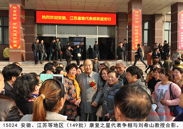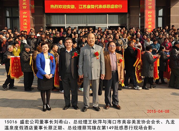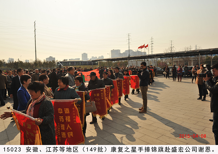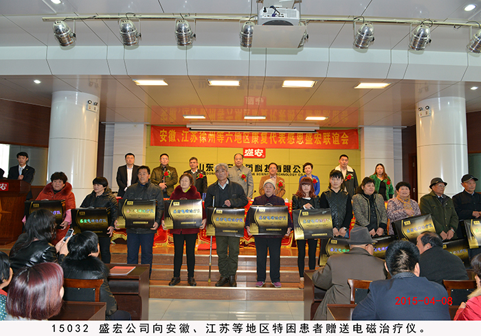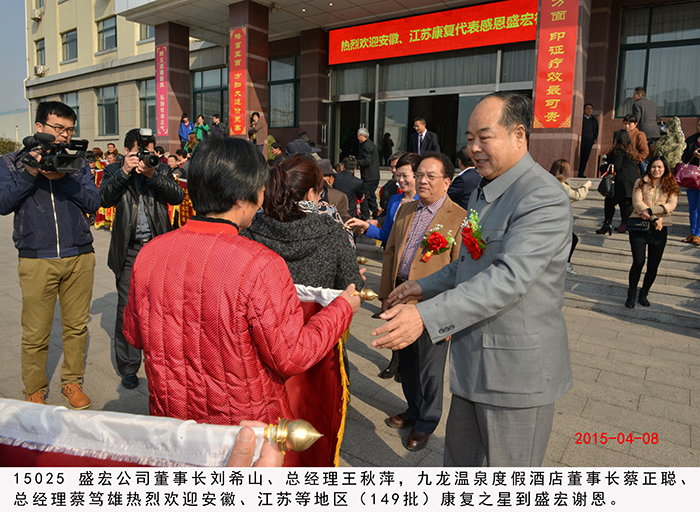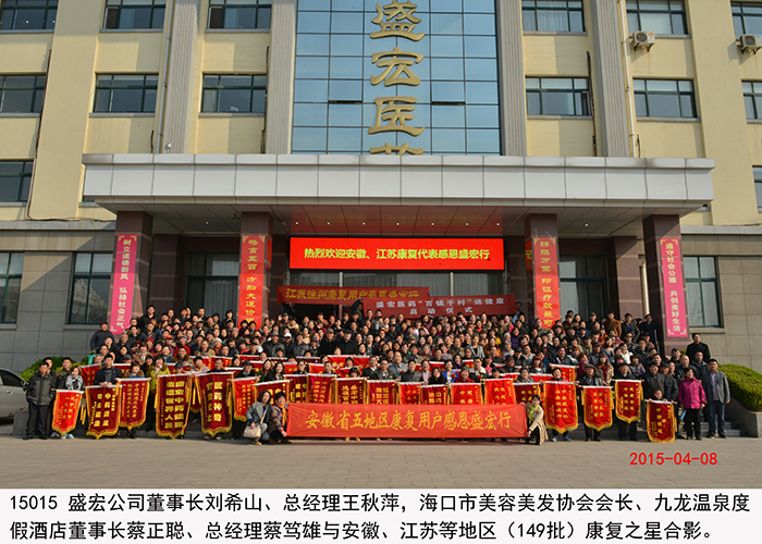 安徽、江蘇第149批股骨頭壞死等患者赴盛宏謝恩 2015年4月8日,安徽省五地市與江蘇徐州的近300名股骨頭壞死、腰椎間盤突出、頸椎病等頑疾康復患者攜帶錦旗,不遠千里來到山東盛宏醫藥公司謝恩。透化療法專利發明人、盛宏公司董事長劉希山,總經理王秋萍親切接見了謝恩者。中國人民解放軍濟南軍區黨委常委、裝備部原部長、第26集團軍原軍長朱文玉將軍,中國人民解放軍總參謀部王福年主任,海口市美容美發協會會長、九龍溫泉度假酒店董事長蔡正聰、總經理蔡篤雄一行也蒞臨現場。康復患者們紛紛向劉希山教授獻上了滿懷感激之情的錦旗。至此,赴盛宏謝恩的康復患者達到了27省、100多地市、149批,共計五萬多人次。劉希山董事長向安徽、江蘇的特困患者捐贈了專治頑疾的盛宏電磁治療儀。 王秋萍總經理致歡迎詞。安徽中藥提速服務中心主任黃鳳偉代表康復患者向劉希山教授和盛宏公司全體員工致感謝詞。朱文玉將軍、蔡正聰董事長一行目睹醫患之間的真情后深受感動,對劉希山董事長造福人民的事跡以及濃郁的盛宏文化給予高度評價。據了解,劉希山教授十八年前發明電磁治療儀,共榮獲國家專利37項,國家衛生部原部長錢信忠為盛宏題詞“中藥提速,造福人民”,莫言先生題詞贊劉希山教授“哲人奇人”。 附部分康復病例: 1、李傳榮,女,63歲,江蘇人。多年前腰部和脊椎遭受碰撞,導致無法正常行走,腰常年直不起來,大家都笑稱“羅鍋腰”,非常痛苦。后經朋友介紹使用盛宏產品治療了五個月,現在(2015.4.8)不僅腰直起來了,還能幫助家人干活,這次特意到盛宏感謝劉教授。 2、潘劍,男,67歲,江蘇徐州人。這次是為夫人來盛宏感謝劉希山教授,其夫人患有多年的腿部積水,醫院建議做腿部抽水手術,聽朋友說有人到醫院做腿部抽水手術而導致死亡,所以一直沒有做。后了解到盛宏產品,連續使用兩個月,效果明顯,現在(2015.4.8)能下地走路,基本恢復正常。在感恩現場含淚獻歌兩首,以表達自己及夫人的感激之情。 3、王紅芹,女,29歲,安徽人。由于生孩子時沒有保護好,患了腰椎間盤突出,基本每天都躺在床上,自己的孩子都無法照看,非常痛苦。經朋友介紹了解到盛宏產品,試用2周后,腰部疼痛有所減輕,后連續使用一個多月,現在(2015.4.8)已經基本康復。在感恩現場王女士感動得說:“孩子,媽媽又能抱你了,是劉教授讓我重新站起來,讓孩子有了一位健康的媽媽!”