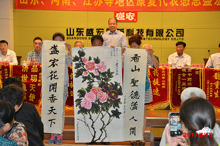 2017年5月16日,山東、河南、江蘇等省的300名腰椎間盤突出、股骨頭壞死、頸椎病、肩周炎等頑疾康復患者赴盛宏公司謝恩。各地用戶為表達感恩之情,或制作錦旗,或書寫字畫,有的還為劉希山教授帶來了山藥、足浴盆等當地土特產。至此,赴盛宏謝恩者已經達到了27省、100多地市、160批,共計六萬多人。一位山東老先生贊嘆:“感恩盛宏行,在中醫藥的史冊上前無古人,在西藥的史冊上更不曾見到,它創造了一個懸壺濟世的世界壯舉!它比任何一項吉尼斯世界紀錄都更有意義!”