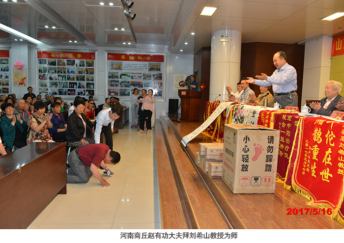 趙先生說,河南是人口大省,也是癌癥大省,健康危機一直困擾著大家。盛宏多年來一直致力于治療各種疑難雜癥,他希望把盛宏公司產品和盛宏堂精髓傳承到河南,救助更多的病人。趙有功先生今天說出來一直以來的一大愿望:拜劉希山教授為師。在雷鳴般的掌聲下,劉希山教授欣然允肯。在大家共同見證下,趙先生在現場叩頭拜師,并流下了激動的淚水。