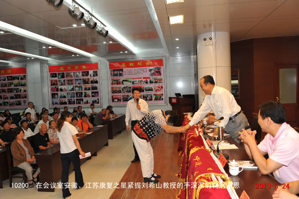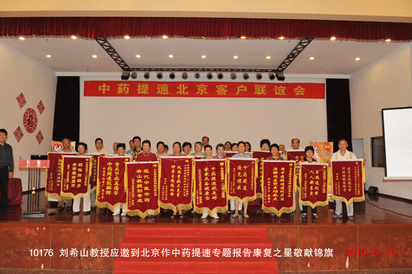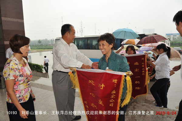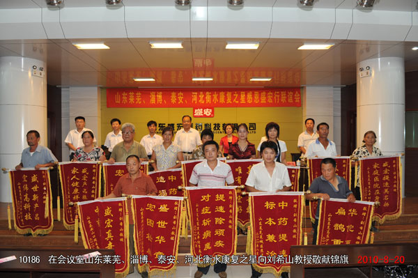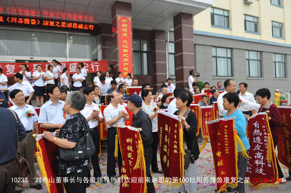 今天,四川、江蘇、河南、山東的300多名頑疾康復患者分乘七輛大巴攜帶錦旗而來,他們得的是股骨頭壞死、腰椎間盤突出、頸椎病等頑疾。在感恩行現場,康復患者爭先恐后擁向劉希山董事長,獻上錦旗并鞠躬感謝。張國春,平度人,2003年患股骨頭壞死,不能蹲起、不能自理、痛苦不堪,2004年開始使用中藥提速,治療半年時間康復,可以正常活動與工作,至今未復發。張先生向劉希山教授深深鞠躬致謝……用戶熱淚盈眶、真誠謝恩的一幕幕場景令人震撼!通過使用電磁治療儀或自熱透化帶而康復的謝恩者今天正好是第100批,涵蓋了25省、100余地市,總人數超過了12000名。