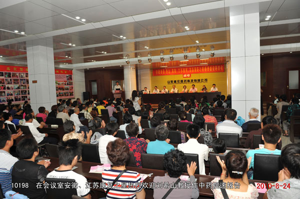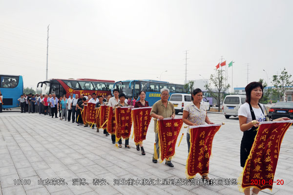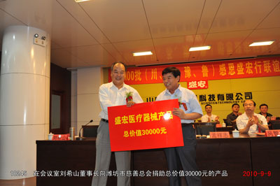 2010年9月9日,盛宏公司愛心捐贈醫療器械產品暨第100批感恩盛宏行到達儀式在高新區盛宏公司會議室舉行,濰坊市婦聯主席聶振萍、市藥監局局長咼智義、市民政局局長孟祥志、市高新區管委會副主任牟丕宗、市藥監局副局長牛世禮、市慈善總會副會長馬全海等領導出席儀式并分別講話,各位領導對盛宏公司的科技創新和醫患和諧給予高度評價。王秋萍總經理致歡迎詞。劉希山董事長最后作中藥提速健康報告。