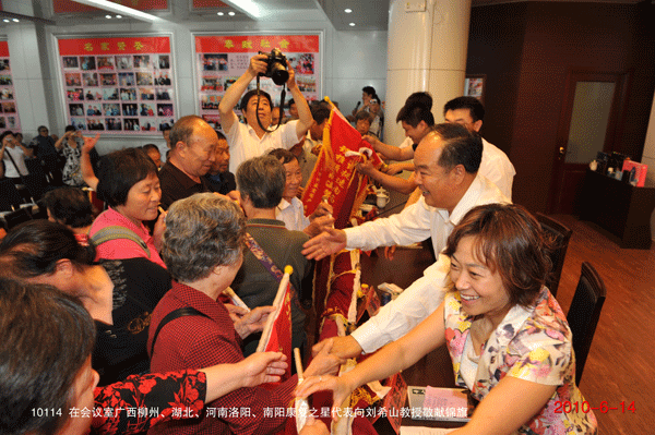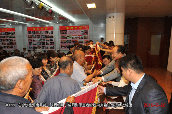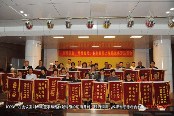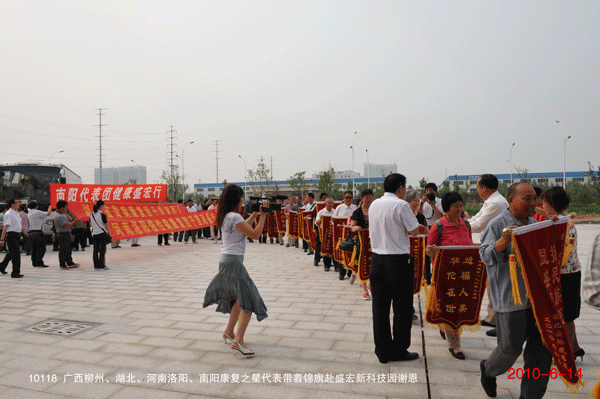 “盛宏造福福萬戶,萬戶依戀戀盛宏!” 2010年6月14日,正值端午節來臨之際,廣西柳州、湖北和河南洛陽、安陽的300多名康復患者攜帶錦旗到達盛宏感謝,這是湖北李忠發先生代表湖北患者向中藥提速專利發明人劉希山教授獻上的字畫。至此到盛宏總部謝恩的康復患者代表達到了25省100余地市76批共計8000多名。王秋萍總經理致熱情洋溢的歡迎詞,湖北服務中心主任魏天明、河南洛陽服務中心主任王濤、柳州服務中心主任何煒分別代表康復患者致感謝詞。 “氣為血之帥,血為氣之母,血通則氣通,血止則氣絕。導致頑疾的原因是氣滯血瘀,導致猝死的原因是氣絕血凝”,劉希山教授的中藥提速健康報告受到客人們熱烈歡迎,“盛宏中藥提速沿用了古代砭、針、灸、藥的中醫治病原理,采用其方法,不用其做法,電磁、電熱、遠紅外、強透化、藥氣離子導入五大現代技術,迅速活血化瘀,打通血脈,對治療股骨頭壞死、肝病、腎病、腰椎間盤突出等頑疾實現了快速見效,先后榮獲了31項國家專利……這就是為什么‘盛宏電磁治療儀,仿冒產品可以與其形似,但無法神似;可以模仿它的外觀,但無法模仿它的療效’的根本原因!” 康復患者們紛紛向劉教授獻上錦旗,并鞠躬感謝,醫患之情如魚水交融,感人至深。楊春梅老人五次鞠躬不已的場面讓人熱淚盈眶。年過八旬的湖北天門市革命傷殘軍人、離休干部董俊林老先生不能親來,托人帶來了一面錦旗和他的親筆感謝信,信中寫道:“我從2003年開始認準盛宏,盛宏把我從死亡線上拽了回來。我向劉教授獻上一首歌:沒有盛宏儀,沒有我康健;沒有劉希山,沒有我今天……”宣讀之后,全場動容。