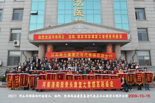 舉國歡慶六十華誕,盛宏笑迎六千嘉賓。2009年10月16日,正值“雙節”過后,又是第十一屆全運會開幕式在山東舉行的好日子,河南商丘、洛陽、陜西西安的130余名頑疾康復患者滿懷感激之情,不遠千里到達盛宏公司謝恩。至此,到盛宏謝恩的患者已達25省、80余城市共計52批近6000人。千千萬萬股骨頭壞死、頸椎病、腰椎間盤突出、關節炎、肩周炎等頑疾患者的康復鑄就了盛宏電磁治療儀“骨病克星”的口碑。