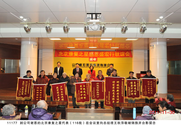 2011 年11月30日 ,來自北京的200多名頸椎病、腰椎間盤突出、股骨頭壞死、肩周炎、關節炎等康復之星抵達盛宏公司感謝。至此,全國共有25省、100多地市、116批共計近19000名康復患者到盛宏謝恩。盛宏公司總經理王秋萍致歡迎詞,北京中藥提速服務中心主任袁道田代表康復患者致感謝詞。廣大康復之星們現場交流了使用盛宏透化帶快速康復的治療體會,那真誠的感恩之心和感謝話語引起全場陣陣共鳴的掌聲。