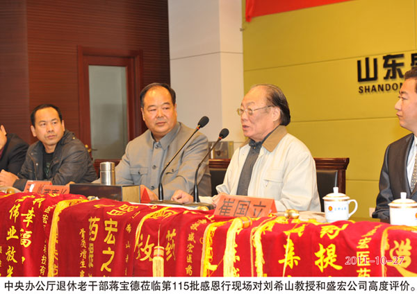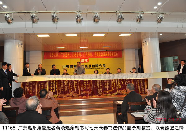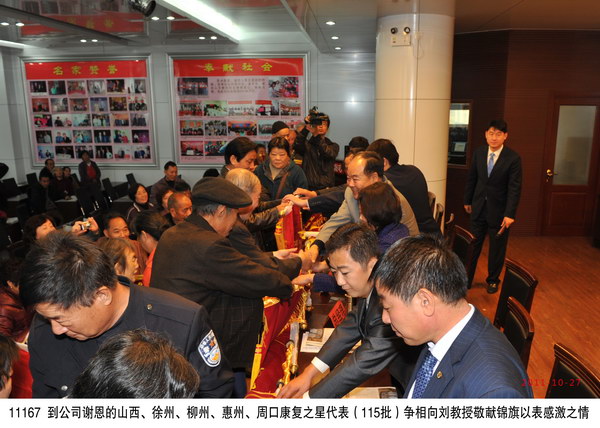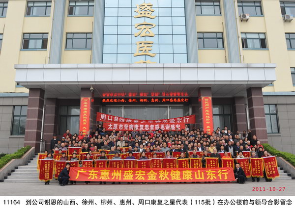 2011年10月27日,廣西柳州、江蘇徐州、山西太原、廣東惠州、河南周口等地的300名股骨頭壞死、腰椎間盤突出等頑疾康復患者到達盛宏謝恩獻錦旗,謝恩者達到25省、100多地市、115批,總人數18000多名。劉希山董事長、王秋萍總經理親自迎接從全國四面八方趕來的客人。王秋萍總經理致歡迎詞,劉希山教授為大家作中藥提速健康報告。康復患者們爭先恐后獻上了一面面感恩的錦旗;惠州書法協會副會長蔣曉煜先生專門創作了一幅7米書法長卷贈劉希山教授,表達敬仰之情;柳州畫家孫鳳蘭女士托人獻上了表現劉希山教授懸壺濟世功績的國畫——《碩果》。全場氣氛熱烈感人。 部分康復病例: 1、史美清,女,柳州人,雙側股骨頭壞死患者,1994年發病,經歷12年病痛,于2006年已經嚴重壞死,達V期,痛苦到“想早點死”。當年10月開始使用電磁治療儀,用藥3年零8個月康復,至今(2011年10月27日)已經停藥兩年,無復發。 2、李懷春,女,徐州人,10年前患乳腺癌,治療后留下后遺癥,胳膊浮腫,僅用了十幾天,現在(2011年10月27日)癥狀基本消除。她說著說著激動地哭了。 3、車順奎,男,65歲,廣東惠州人。2004年患腰椎間盤突出,壓迫神經,癱瘓在床27天,堅持不做手術。后用盛宏電磁治療儀做保守治療,1個月能下床走路,8個月痊愈。數年來沒有復發。 4、段新玉,女,太原人,2008年確診患有股骨頭壞死III期,不能翻身、不能睡,2010年開始使用電磁治療儀,7個月扔掉了拐杖,1年康復。
