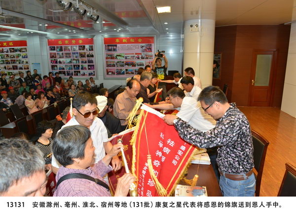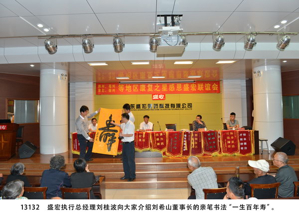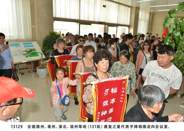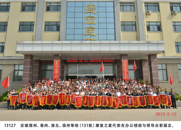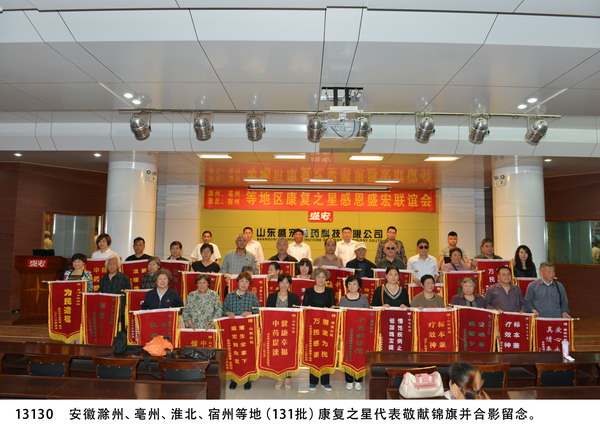 2013年5月13日,安徽滁州、亳州、淮北、宿州等地的300多名股骨頭壞死、腰椎間盤突出、脈管炎等康復患者來到盛宏公司、盛宏中醫院謝恩并敬獻錦旗,盛宏執行總經理劉桂波率管理層熱情迎接謝恩者。至此,赴盛宏謝恩的康復患者達到了27省、100多地市、131批共計三萬多人。 劉總致歡迎辭,安徽省服務中心主任黃鳳偉致感謝詞,因應邀到西藏講學而不能親自現場的劉希山教授通過主持人向大家致以親切問候。盛宏中醫院院長劉庭海為大家作健康報告:“有病要治療,但是要科學合理的治療。中藥透皮十全療法為什么治療股骨頭壞死、腰椎間盤突出會有如此神奇的療效?就是因為這是真正科學、真正綠色的療法。現在已經立夏,正是治療股骨頭壞死、腰椎間盤突出等骨病的最好時節。由于夏季人體陽氣達到四季高峰,肌膚腠理開泄,使用中藥透皮療法,藥物最容易由皮膚滲入穴位經絡,能通過經絡氣血直達病處,所以在夏季治療骨病,往往可以達到最好的效果。這就是‘冬病夏治’。”劉庭海院長還跟大家交流了一些日常護理小秘方,受到大家熱烈歡迎。 謝恩者拿著一面面鮮紅的錦旗走向主席臺向盛宏工作人員敬獻錦旗。公司面向全國推選了“健康之星”,并公布了名單。此次感恩行隊伍中也將評選出八位“健康之星”,將獲得已申請國家專利的劉希山董事長親筆書法“一生百年壽”和“一步登天福”。