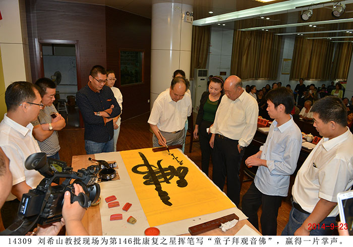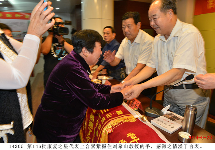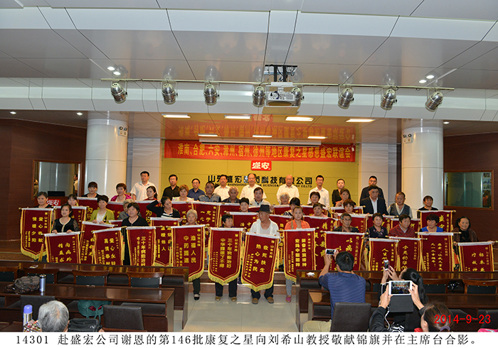 “劉希山教授在中醫藥研發上能獲得37項國家專利,他能治愈百萬頑疾患者,他所走到的地方都是鮮花的海洋、錦旗的世界,關鍵在于他對自己太狠,對患者太愛!”這是國學研究會會長桑炳明在全國第146批康復患者感恩盛宏行現場發自內心的評價。 2014年9月23日,淮南、合肥、六安、滁州、宿州、徐州等地230多名股骨頭壞死、腰椎間盤突出、頸椎病、糖尿病等頑疾患者到盛宏公司謝恩,并向他們的恩人——中國民族醫藥開發委員會副會長、山東省優秀共產黨員劉希山教授敬獻了錦旗。盛宏公司董事長劉希山、國學研究會會長桑炳明,華風書畫院院長呂傳義等親切接見了這批謝恩者。至此,赴盛宏謝恩的康復患者達到了27省、100多地市、146批共計五萬多人。 國學研究會會長桑炳明、華風書畫院院長呂傳義高度評價劉希山教授的醫術和醫德。為了攻克股骨頭壞死等世界醫學難題,為了中醫藥治療頑疾快速高效,為了讓患者用藥安全放心,劉教授當年口嘗百藥導致胃部大出血,胃被切除四分之三,他昏迷三天三夜,九死一生。現在企業發展了,劉希山仍然非常節儉,同員工吃一樣的工作餐,卻拿出了1000萬元設立了“盛宏慈善基金”。一個“狠”字和一個“愛”字,就是希山精神!他們還稱贊《希山格言選》是一本難得的國學寶典。 人逢喜事精神爽。這么多全國患者獲得康復來謝恩,劉希山教授格外高興,他為客人作了一場精彩的健康報告。滿堂歡聲笑語,時而爆發出雷鳴般的掌聲。王保友、孔德華等一位位康復患者滿懷感恩之情分享了自己的康復經過。