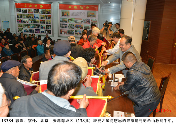 2013年10月27日,陸敬留先生與自發組織到山東濰坊謝恩的其他100多位江蘇宿遷康復用戶,一起來到了盛宏公司總部,感謝中藥提速發明人、山東省優秀共產黨員、被莫言譽為“哲人奇人”的劉希山教授,同期到來的還有北京、天津、甘肅敦煌等地的近200名康復患者,他們最遠的長途跋涉6000多里,其熱情讓人感動不已。盛宏公司董事長、盛宏中醫院院長劉希山親自接見各地謝恩者,并為大家作了一場精彩的養生和康復報告。最后,劉希山教授應邀揮毫潑墨,現場展示了其豪放大氣的書法藝術作品,令謝恩者大飽眼福。特別是一個“壽”字兩立意境:祥和高雅如觀音的“一生百年青年壽”,豪邁圓妙似太極的“香百年壽”,雖壽出兩種,而俱臻化境——大家無不報以熱烈的掌聲。