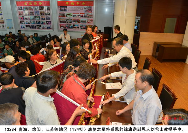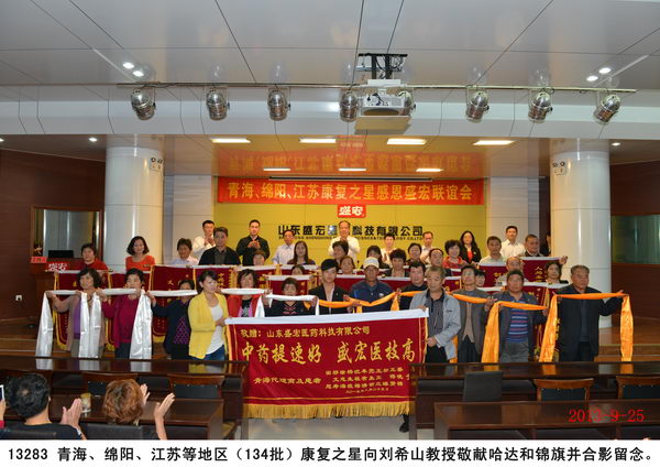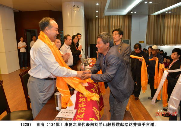 楊老是盛宏電磁治療儀治愈的千千萬萬患者中的一個代表,每一位謝恩者都有著類似的康復經歷和感恩之情。正如劉希山教授所說:“你要得到大家的掌聲,你就要把歡樂送到大家手中!”各地康復患者們紛紛將謝恩錦旗獻上劉希山教授,而青海包括藏民在內的各族同胞還向劉希山教授獻上了象征著最高敬意的金色哈達以及象征著純潔無暇的白色哈達——此時,劉教授的大愛和康復患者的真情交融在一起,這一瞬間喚醒了人們的真情,讓現場很多人熱淚盈眶。